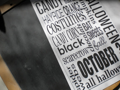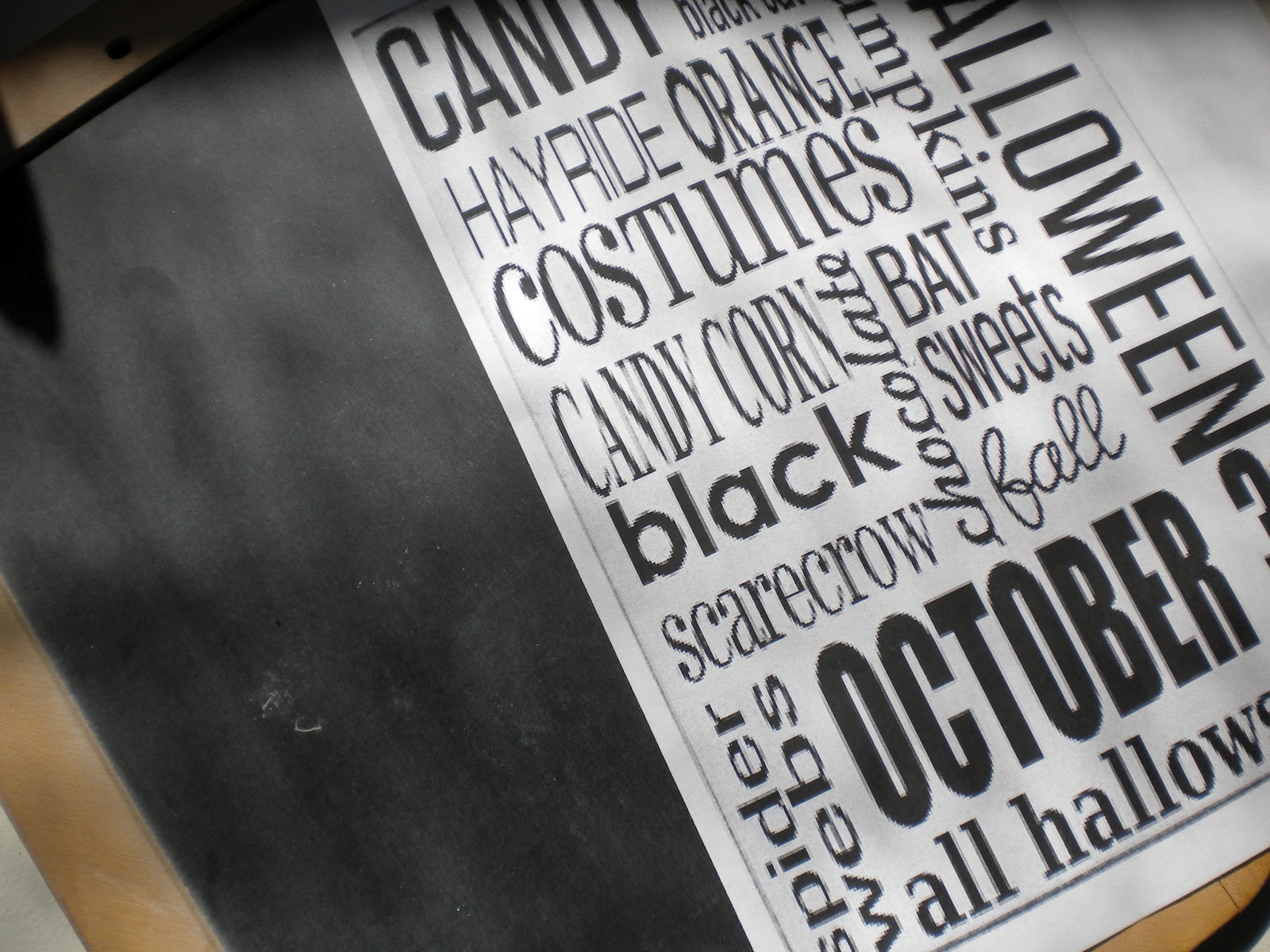 So, the first step is finding what you want to transfer.... an image, some typography... or even a bit of both. There are tons of free images/printables out there or you can even make you own using a variety of computer fonts, like I did with my last chalkboard project... I've printed out a number of pages to use... some for holidays, some for fun.... so to pick one for today's project, well... I'll have to go with a Halloween printable. You may need to reduce or enlarge your print to fit your board....