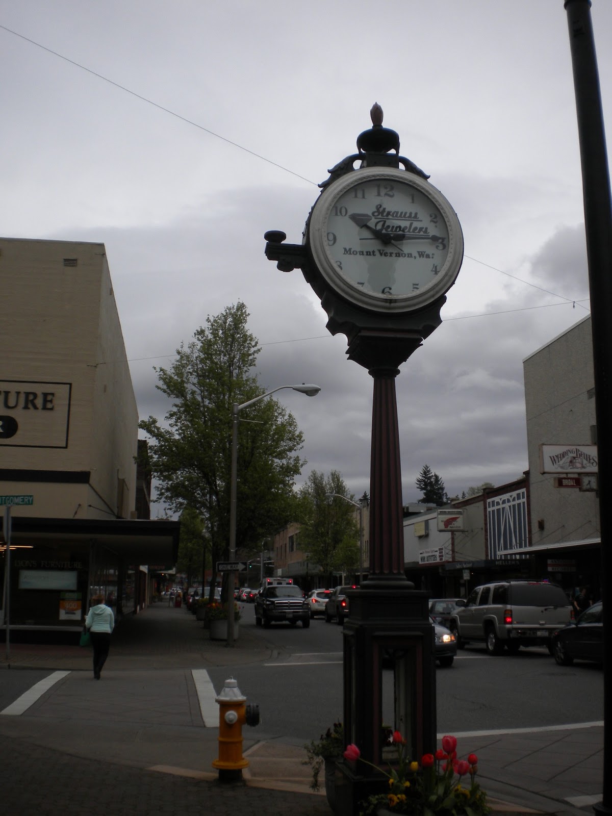 The small town of Mt. Vernon, WA still has a small town feel... including this old clock that still runs. You can see that the town has many, many planters of tulips, for the Skagit Valley Tulip Festival I'm sure.